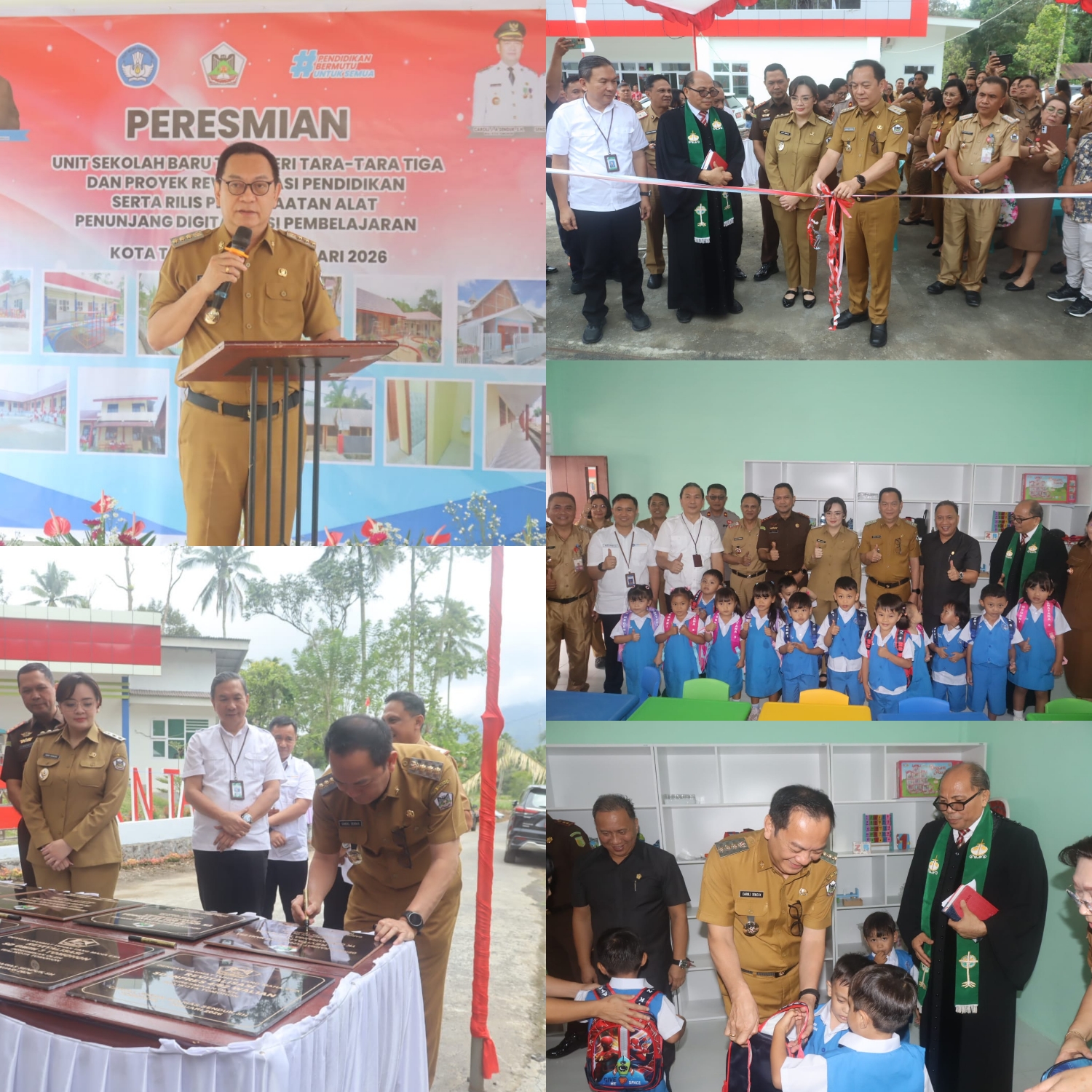 Wali Kota Tomohon secara resmi meresmikan TK Negeri Taratara Tiga dengan membuka selubung papan nama, menandatangani prasasti, serta melakukan pengguntingan pita.