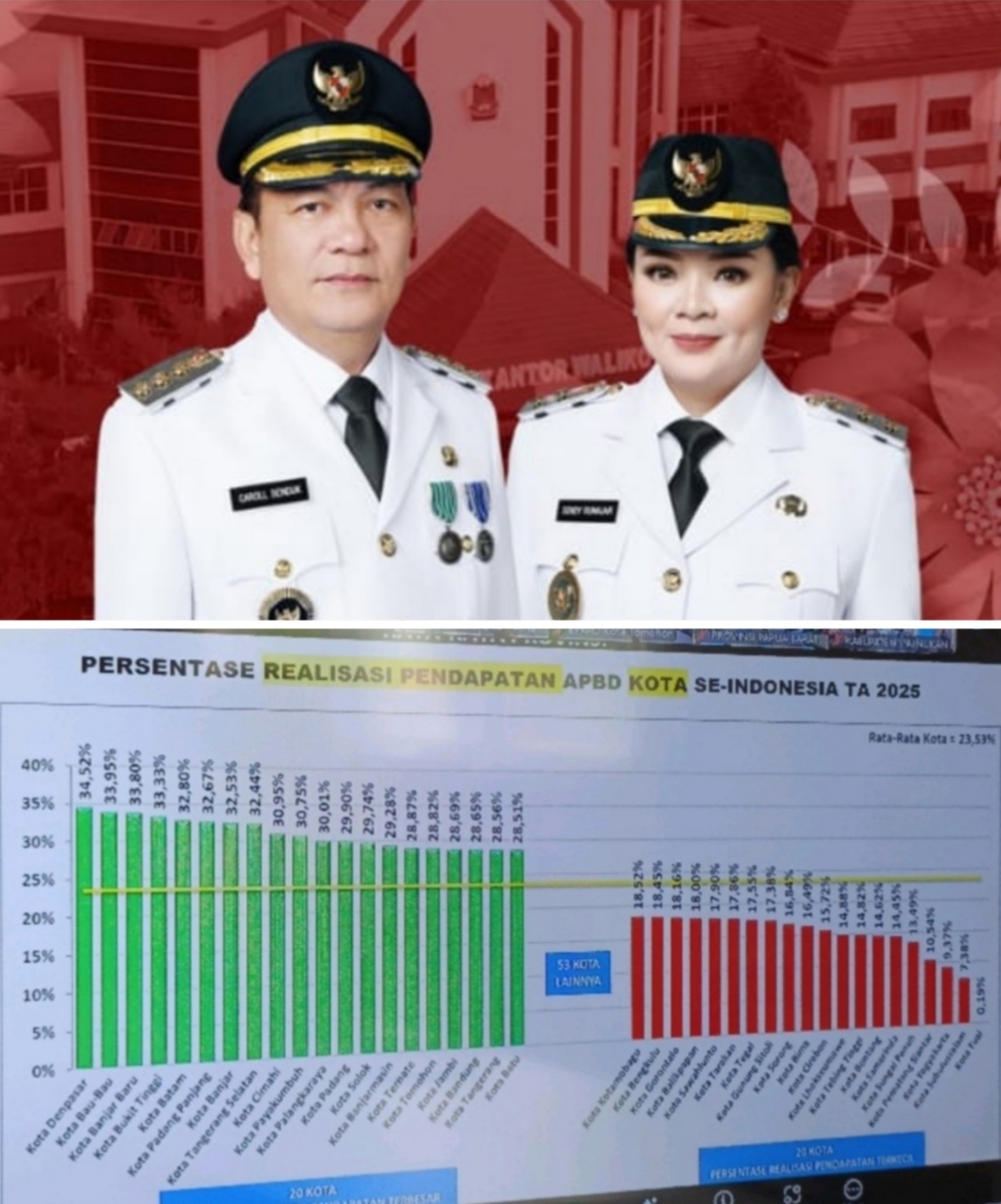 PROMEDIACYBER TOMOHON –Kepemimpinan Wali Kota Caroll Joram Azarias Senduk, SH dan Wakil Wali Kota Sendy G.A. Rumajar, SE, M.I.Kom, Kota Tomohon mencatat prestasi membanggakan dengan menempati posisi 20 besar nasional dalam realisasi pendapatan tertinggi di antara kota-kota se-Indonesia. Kamis (08/05)