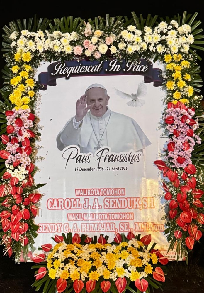 “Atas nama Pemerintah dan seluruh masyarakat Kota Tomohon, kami menyampaikan rasa duka yang mendalam atas wafatnya Paus Fransiskus. Beliau adalah tokoh besar yang dikenal karena kerendahan hati, keberpihakannya kepada kaum kecil, serta perjuangannya untuk perdamaian dan keadilan sosial,” ungkap Wali Kota Caroll Senduk.