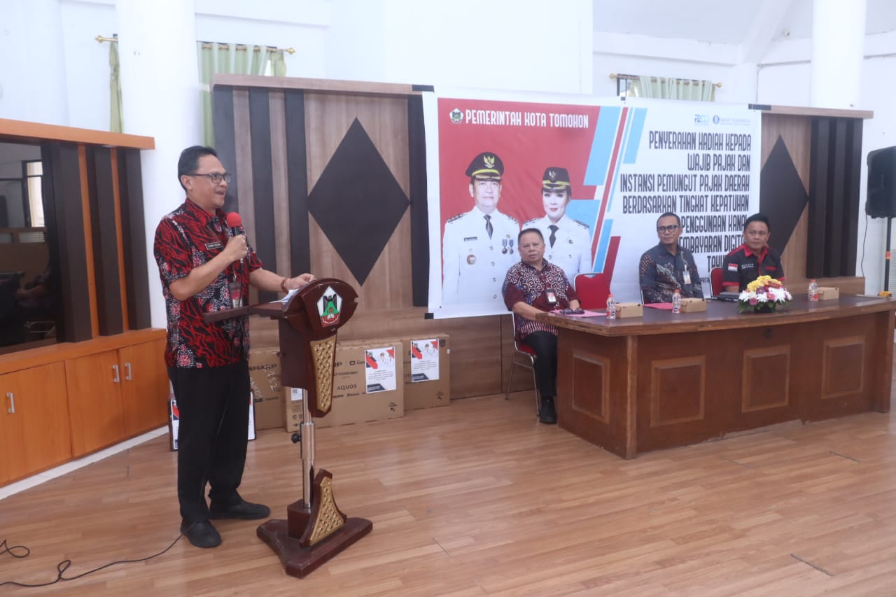 PROMEDIACYBER TOMOHON – Sekretaris Daerah Kota Tomohon Edwin Roring, S.E., M.E. menghadiri kegiatan Penyerahan Hadiah Kepada Wajib Pajak dan Instansi Pemungut Pajak Daerah Berdasarkan Tingkat Kepatuhan dan Penggunaan Kanal Pembayaran Digital Tahun 2025.Dilaksanakan di ruang rapat TUP Sekretariat Daerah Kota Tomohon, Kamis (15/05)